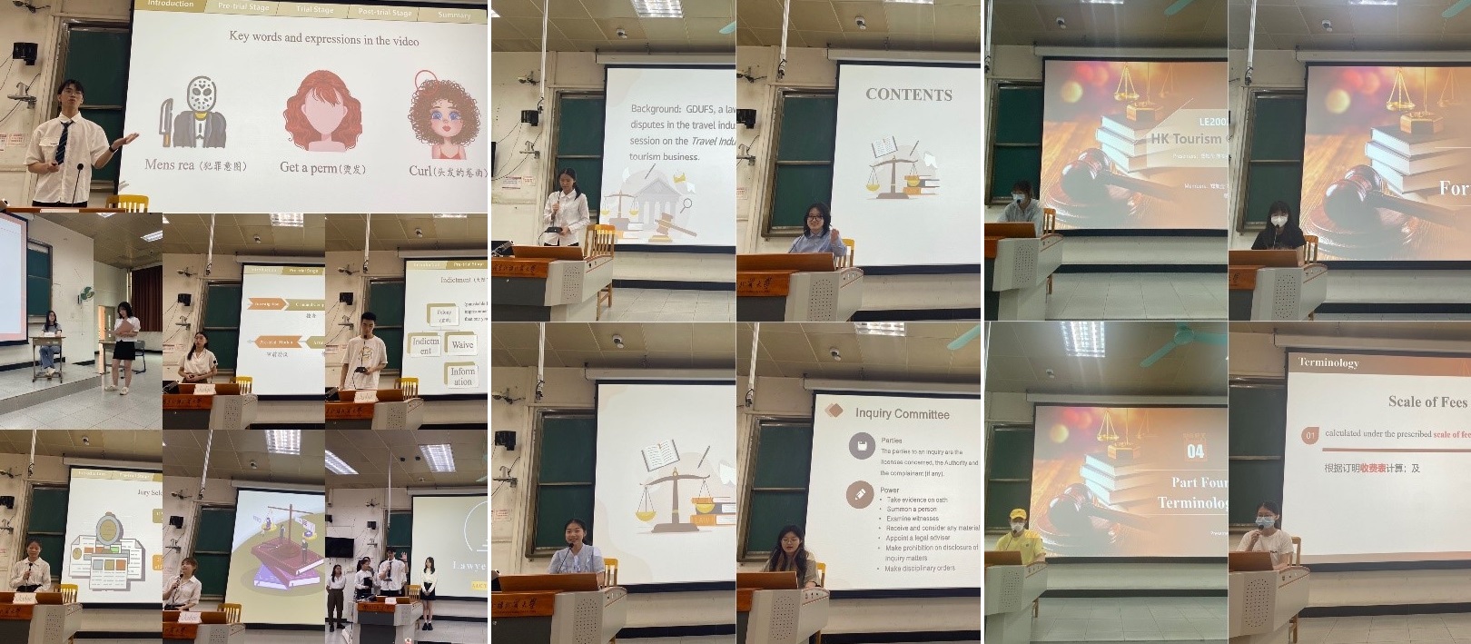 参赛的六个小组围绕《联邦刑事诉讼规则(Federal Rules of Criminal Procedure)》及《香港旅游条例(Travel Industry Ordinance)》,采用多种形式进行展示。有的组采用了真实场景再现方式予以展示,有的组采用新闻发布会形式展示,效果都出人意料的好。其中2001联邦刑诉组设置了新闻播报,并在现场进行扮演证人律师及法官,向观众生动形象地展现了美国刑事诉讼程序中的庭审环节;而2003旅游条例组及2001旅游条例组则采用了新闻发布会形式,由队员扮演记者或观众,向专家提问进行提问,专家通过解答向记者和观众解释了香港旅游条例中的相关规定。他们把法律条文落实到实际生活和法律英语学习中,切实地解决现实中面临的问题,令人印象深刻。所有参赛小组在展示中都表现出了沉稳、自信的精神风貌,以及相互支持、相互配合的团队精神。值得一提的是,各小组展示过程中英语口语流利、准确度很高,内容完整且组织逻辑清晰,组员之间衔接紧密、转换自然顺畅,PPT制作精美、动画图表结合。总之,整个比赛现场靓点频出,精彩不断,各参赛队的表现赢得了观众及评委的热烈掌声。