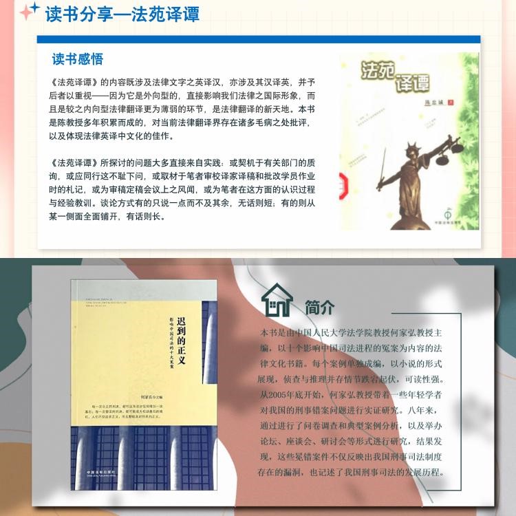 本学期的分享会中,每位同学都会就系里和任课教师推荐的图书分享自己的读书经验和读书报告。大家分享的书籍主题多样化,内容涵盖法律翻译、法律随笔、法律小说等诸多方面,从《西窗法雨》到《圆圈的正义》,从《洞穴奇案》到《迟到的正义》,还有指导法律翻译的专业书籍《法窗译话》等。大家在详细介绍书籍内容的基础上,对书籍中的精彩语句、经典译文和高亮情节进行了点评,无私地奉献了自己在书籍中的所学、所思、所悟。