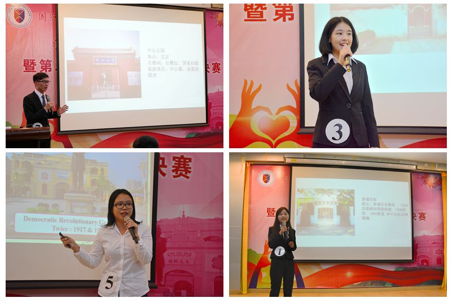 大赛分为“自备英语讲解”、“现场中文讲解 ”和“应急模拟”三部分。第一部分,八位选手用流利的英语讲解了中山纪念堂、孙中山大元帅府纪念馆、孙中山故居等孙中山先生生活和革命的场馆。第二部分随机抽题环节中,无论是《北上宣言》和《国父遗嘱》,还是中山公园和中山装,选手都能淡定应对并能够根据提示词和自己的知识储备快速准备讲解词,最后流畅的讲解出来,赢得了现场观众的阵阵掌声。应急模拟环节,选手们面对“场馆内有人争吵”、“场馆内有人走失”和“听众中有外国友人”等一系列突发问题显然准备得十分充足,并且在实践经验丰富的情况下,从容而又快速地回答了应急措施。