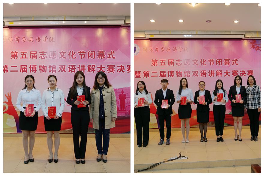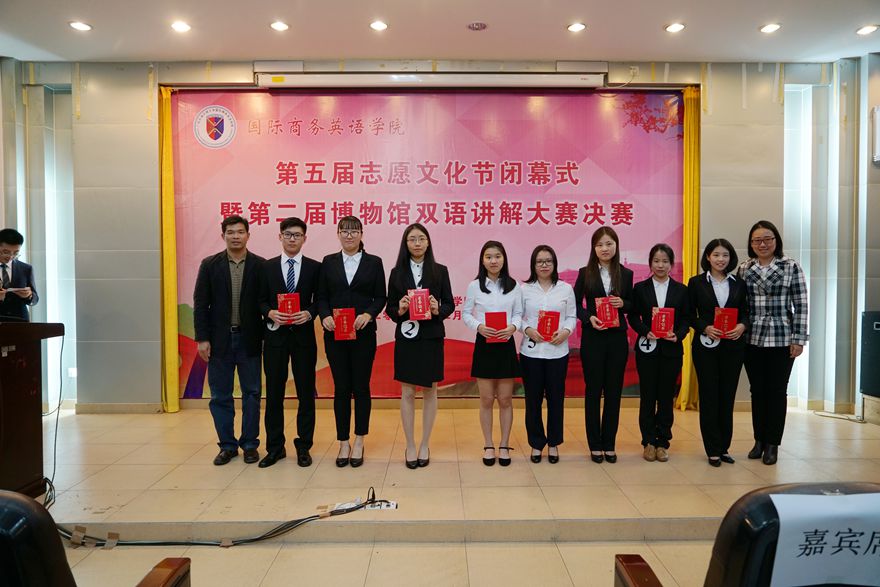 为弘扬志愿文化,让志愿成为大学生的习惯,同时提高广外学子博物馆双语讲解水平,12月1号晚七点,商英学院在七教水上报告厅举行第五届志愿文化节闭幕式暨第二届博物馆双语讲解大赛决赛。中山纪念堂志愿者驿站副站长卜为民,孙中山大元帅府纪念馆英语讲解员吴瀚汀,商英学院党委书记车小真、副书记张林茂,学生处副处长国佳、校团委社会实践部副部长刘茹楠等出席并给优秀志愿者颁发证书。